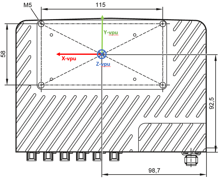 The geometrical reference point of the VPU is the intersection point of the two lines of diagonally opposing mounting points at the back of the VPU. See the figure below for reference.